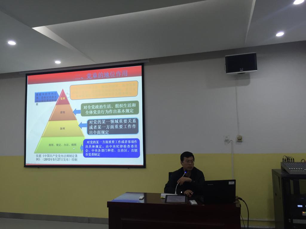 宋文学以“深刻领会“两学一做”重要意义,认真学习党章,严格遵守党章”为主题,结合学校发展和工作实际,交流认识和分享心得,给到会的全体党员讲授了一堂精彩的党课。宋文学从四个方面阐述了共产党员学习党章的重要性和必要性。一是认真学习党章,领会重要意义;二是党章的地位和作用;三是学习党章应重点把握的问题;四是认真学习党章,严格遵守党章。