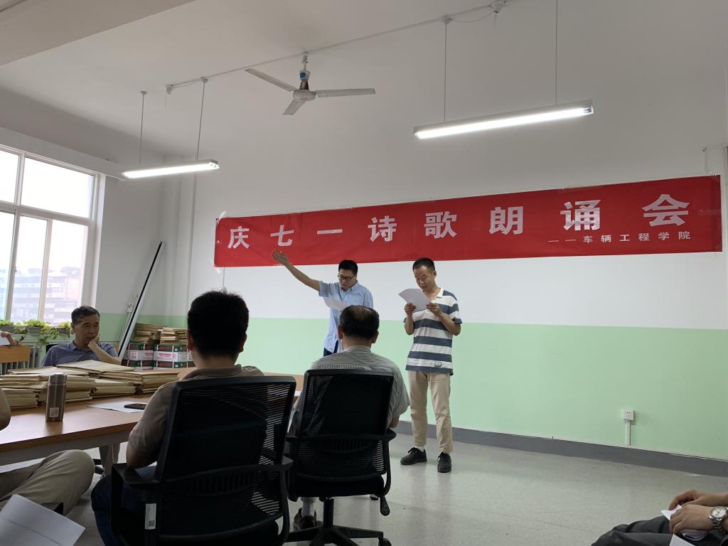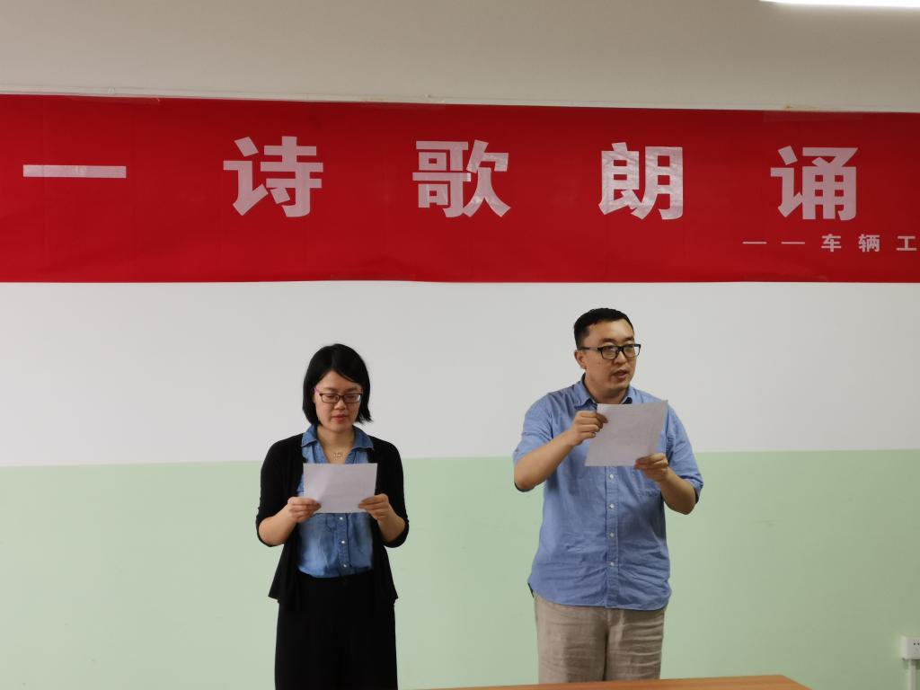 朗诵会上,各室推选出一至三支代表队伍,其中,学院院办由党总支书记、副院长邓北川、综合管理科科长赵坤等朗诵《先给亲爱的祖国》,院长、党总支副书记张耀虎朗诵《我是一滴水》,车辆工程教研室朗诵《祖国颂》、《歌唱祖国》和《辽阔的祖国》,车辆运用教研室朗诵《我爱这土地》、《我爱我的祖国》,学生管理科朗诵《我的祖国》,实验室朗诵《祖国》。朗诵会上,各组队伍以铿锵有力的气势,充沛饱满的爱国热情赢得了全场教师的阵阵掌声,会场气氛非常热烈。