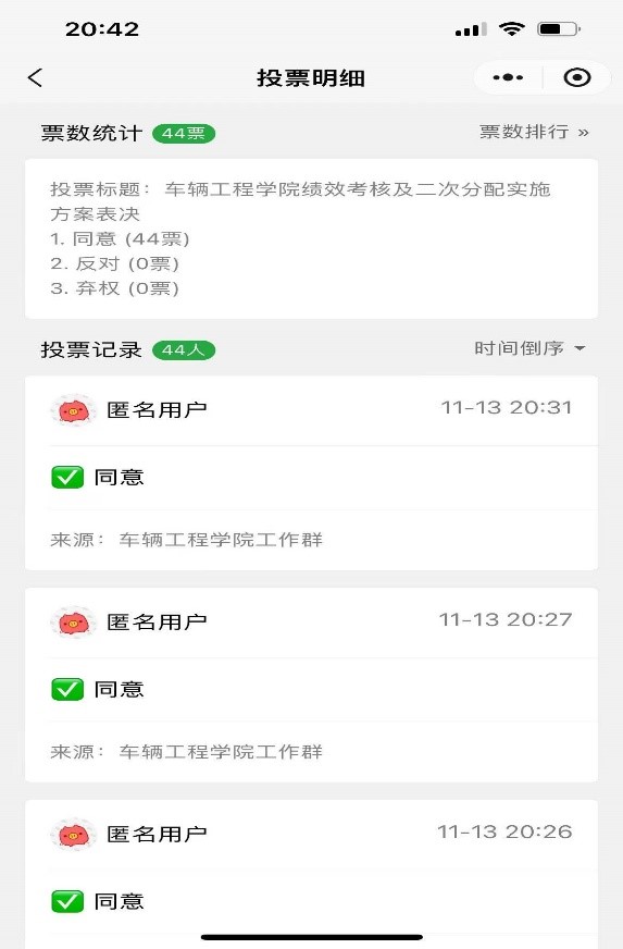 会议第四项,微信投票系统开展线上无匿名投票,进过投票,全票通过该分配办法。