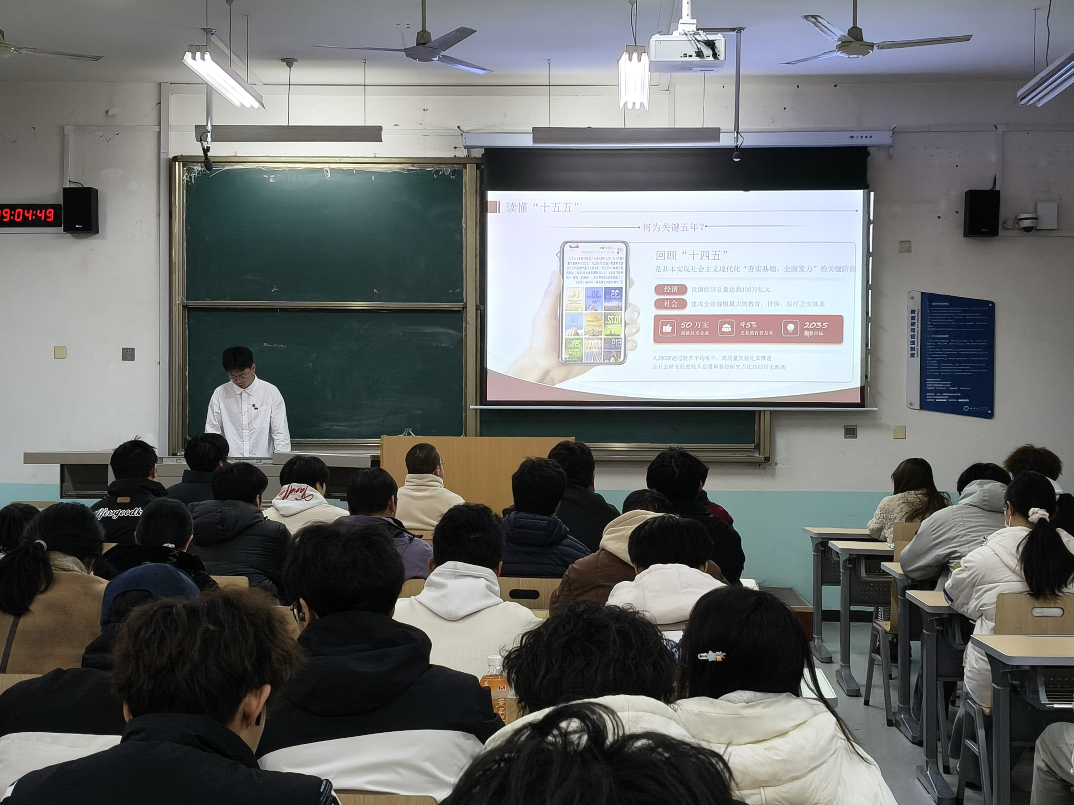 活动由学院团总支行政办韩丁阳担任主讲。内容紧扣“深刻领会‘十五五’规划精神”“精准定位青年历史坐标”“科学规划青春奋斗路径”三大主题展开,系统阐释了“十五五”时期的重大意义、主要目标和重点任务,结合“十四五”时期我国经济社会发展取得的辉煌成就,特别是汽车产业在“电动化、智能化、网联化”转型中的突破性进展,深刻剖析了车辆专业青年学子面临的重大历史机遇与时代责任。